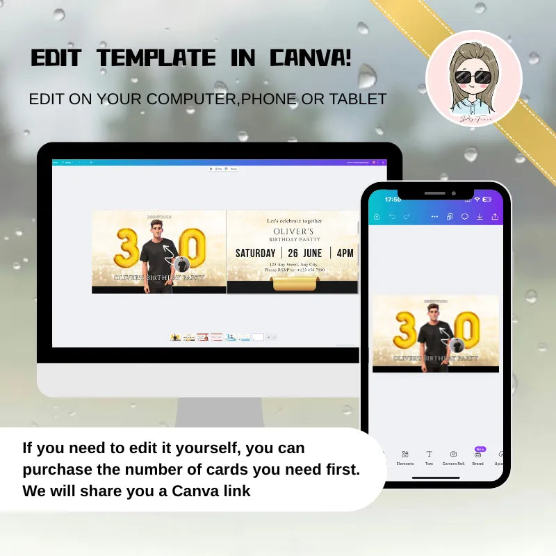 No design skills? No problem. Every order includes a free custom design service. Share the name, date, location, or any personal message you'd like, and we’ll create a unique 30th birthday invitation for men tailored just for him. No Canva editing needed—we do it all for you.