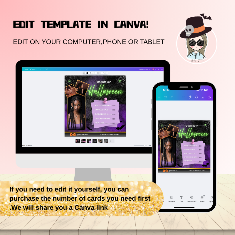 Whether you specialize in vibrant color treatments, intricate braids, or sharp barber cuts – this hauntingly elegant card is your perfect promotional partner this season!